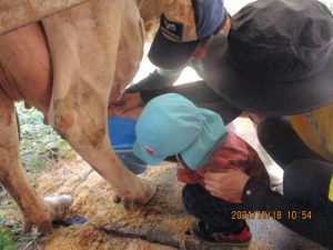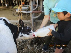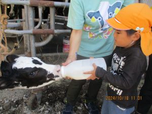 みんなで絞った牛乳を哺乳瓶に入れてもらい、子牛に飲ませました~