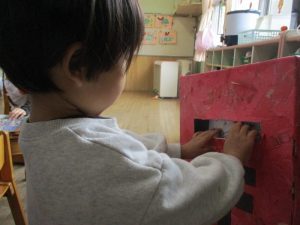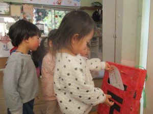 年長児が消印を押したり、クラスごとに仕分けの作業も